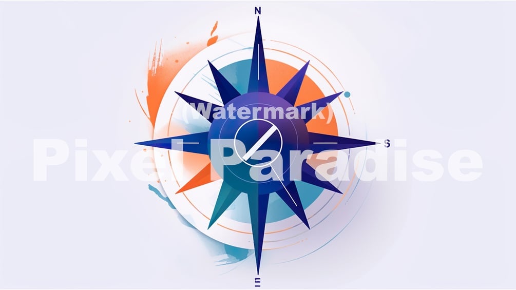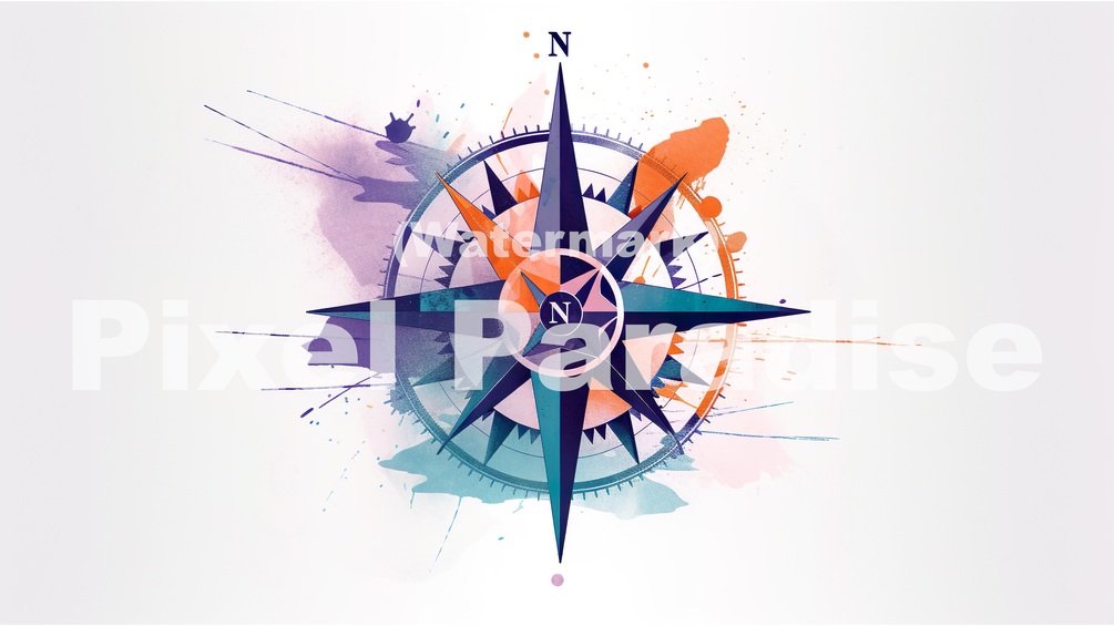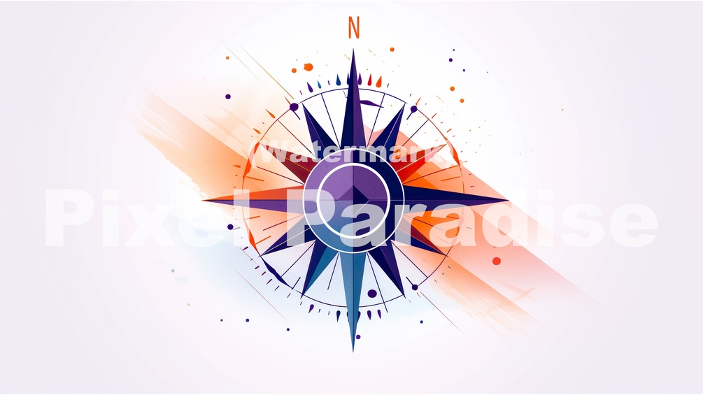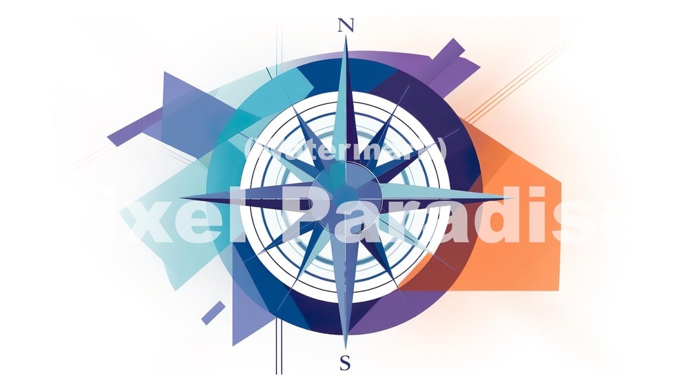 "A Modern Compass Design" is a sophisticated and contemporary wallpaper design that presents a minimalist yet engaging interpretation of the timeless compass symbol. Set against a crisp white background, the wallpaper highlights the sleek compass design, which is artfully crafted using harmonious shades of blue, orange, and purple.